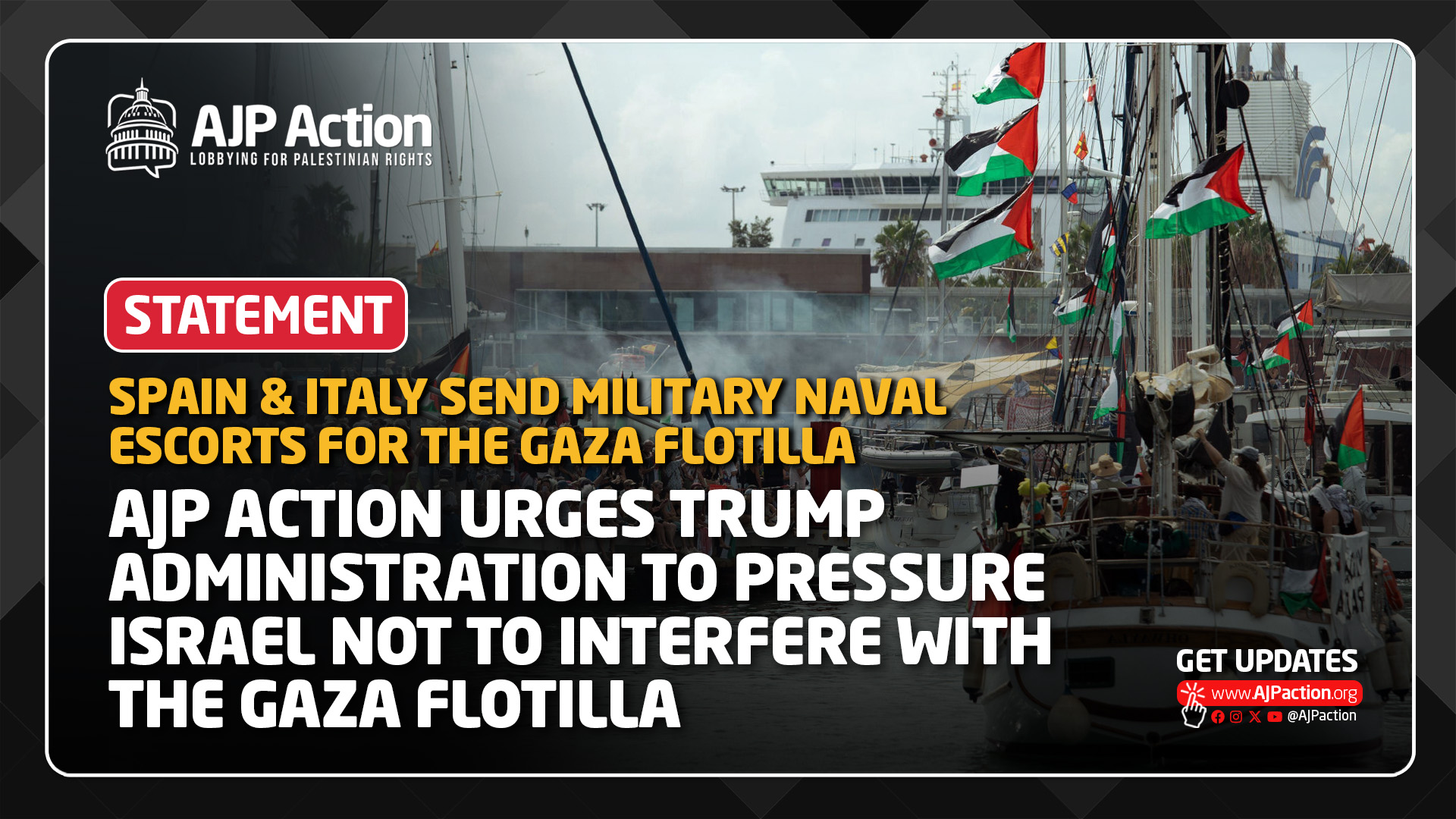 Americans for Justice in Palestine Action (AJP Action) applauds the governments of Spain and Italy for deploying naval vessels to protect the Global Sumud Flotilla, which has been repeatedly attacked while carrying humanitarian supplies to the besieged Gaza Strip. This principled action underscores a basic truth: unarmed civilians bringing food and medicine to a people facing genocide must be protected, and freedom of navigation must be upheld.