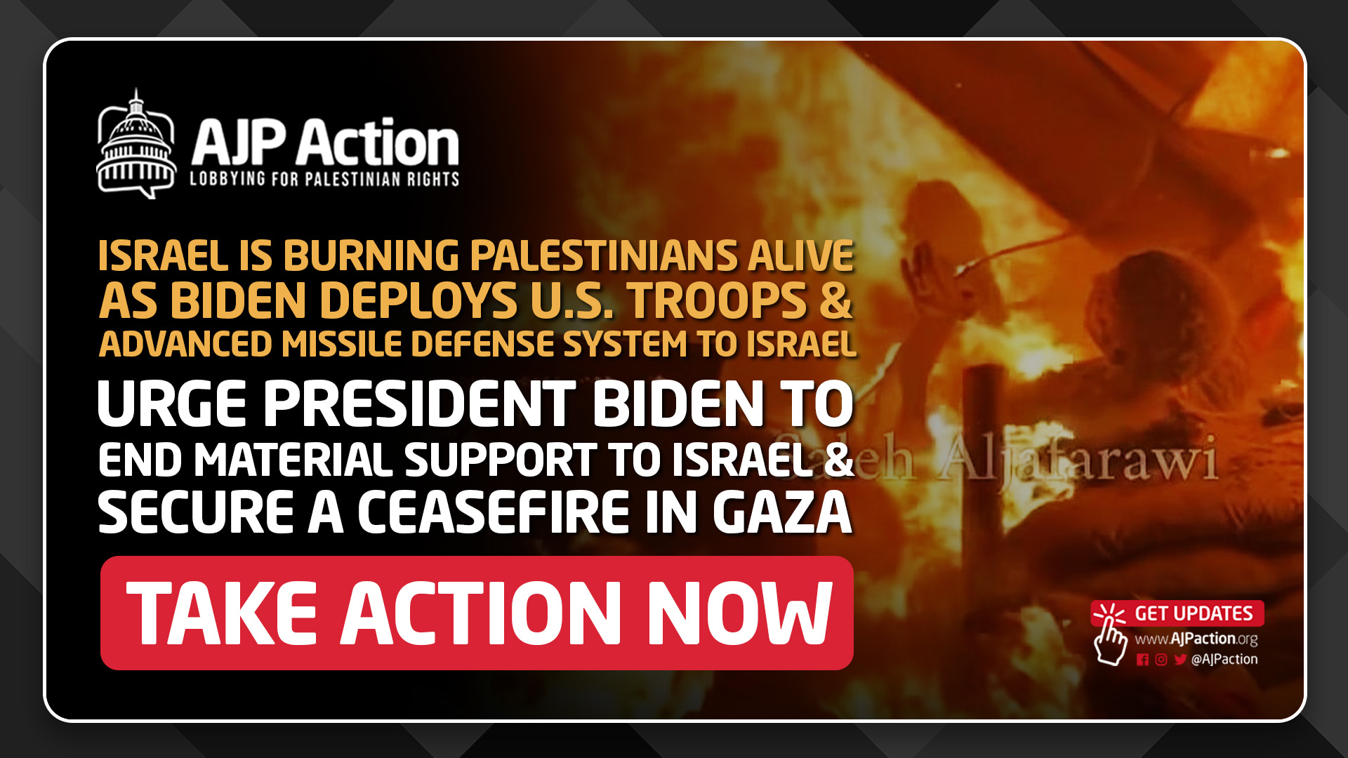 Tragically, even amidst this horrific event—just one of many in the ongoing genocide—the Biden administration has doubled down on its efforts to support and protect Israel. A recent report from Brown University estimates that the U.S. has spent or given Israel more than $22 billion in the past 12 months as Israel carries out these atrocities. Over the same weekend as Israel’s bombing of Palestinians, the President announced the deployment of the United States’ Terminal High Altitude Area Defense (THAAD) missile defense system and 100 U.S. troops to Israel. This military support, coinciding with Israel’s heinous actions of burning Palestinians alive, demonstrates that the United States is not merely a bystander, but a primary enabler of Israel’s genocide and war crimes.