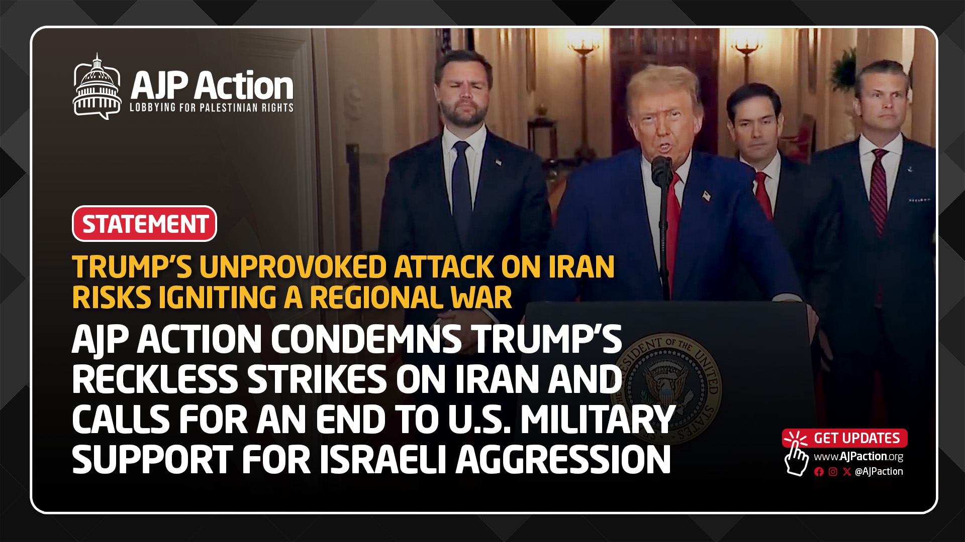 Americans for Justice in Palestine Action (AJP Action) unequivocally condemns President Donald Trump’s decision to launch military strikes against Iran’s nuclear facilities, a reckless act of aggression that threatens to plunge the entire Middle East into an uncontrollable war. These strikes risk starting a dangerous new phase for the Middle East and Americans everywhere.